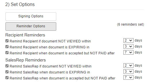Remind SalesRep when document is accepted, but NOT PAID after X days: Selecting this checkbox will send an email to the SalesRep reminding them there is a balance that needs to be paid on the accepted quote.