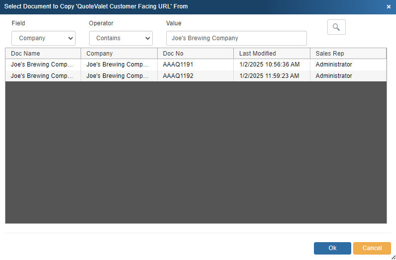 2.This will open the Select Document window. You can search for another document by DocName, DocNumber, or by Company to include in the email.