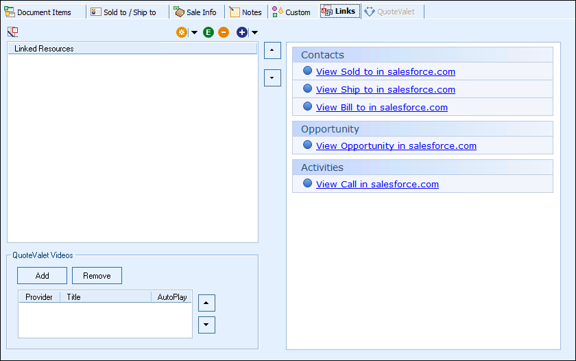 The Auto-Links window creates dynamically generated links on the QuoteWerks Links tab that will link to specific details in salesforce.com from the QuoteWerks created quote.  These links are automatically created and there is no setup involved to use them.