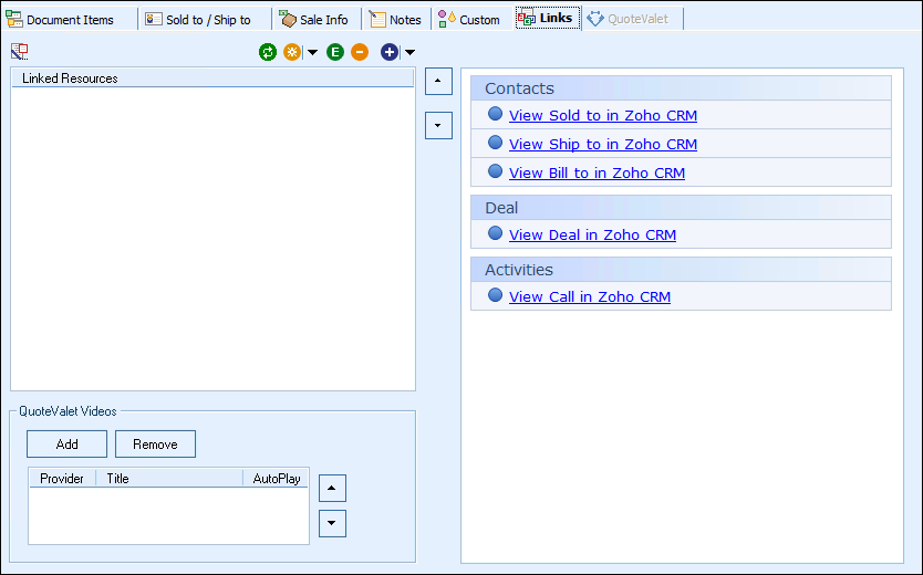 The Auto-Links window creates dynamically generated links on the QuoteWerks Links tab that will link to specific details in Zoho CRM from the QuoteWerks created quote. These links are automatically created and there is no setup involved to use them.