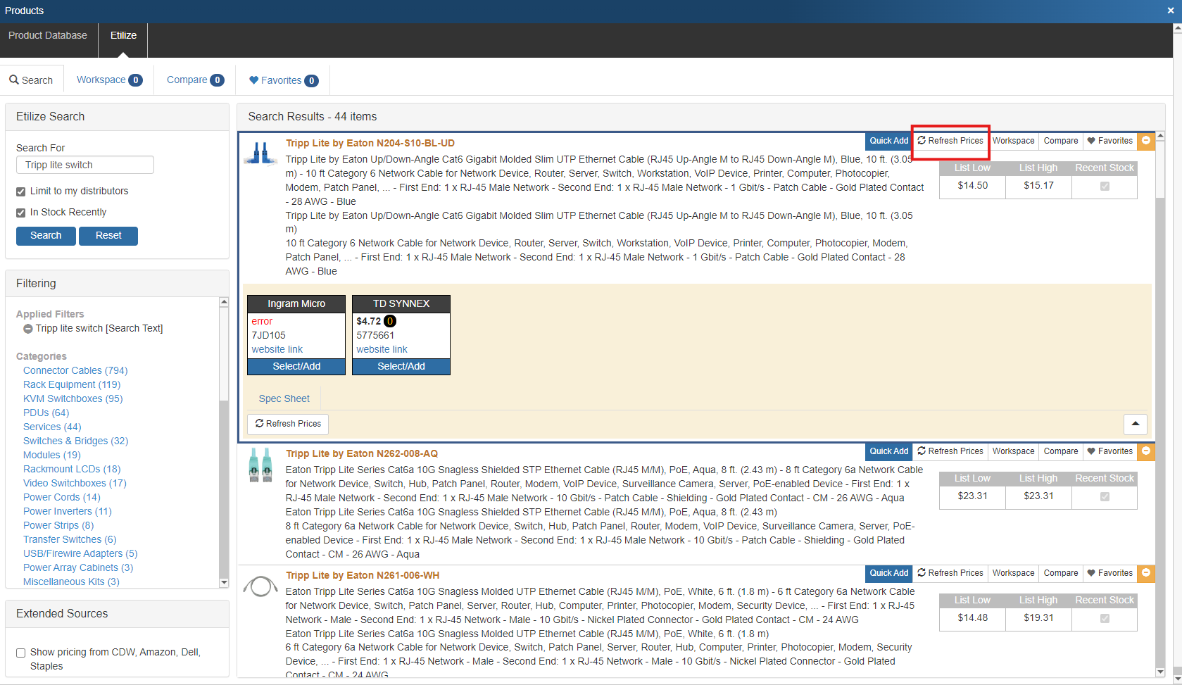 When you select the Etilize product source in the Product Lookup window and search for an item, Etilize will return a list of all the items that match the criteria and, using the distributor real-time pricing, will display the current pricing and availability for each available distributor as well as any local or linked product sources chosen in the Product Sourcing Panel.