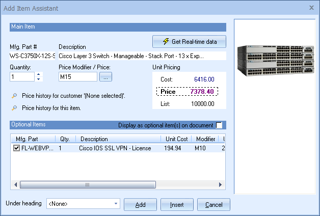 From the Add Item Assistant, you can click on the [Get Real-time data] button. This will display the real-time data window. If you click on the [Accept] button, the Cost and List numbers in the Add Item Assistant will be updated with this real-time data.