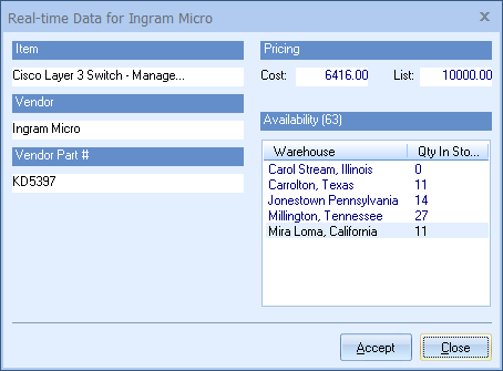 This window will display the real-time cost and list, in addition to the availability and the warehouses for all the stock. There will be a [Close] button at the bottom of the window which you can use to close the window. Depending upon where the real-time data was requested, there may also be an [Accept] button displayed.