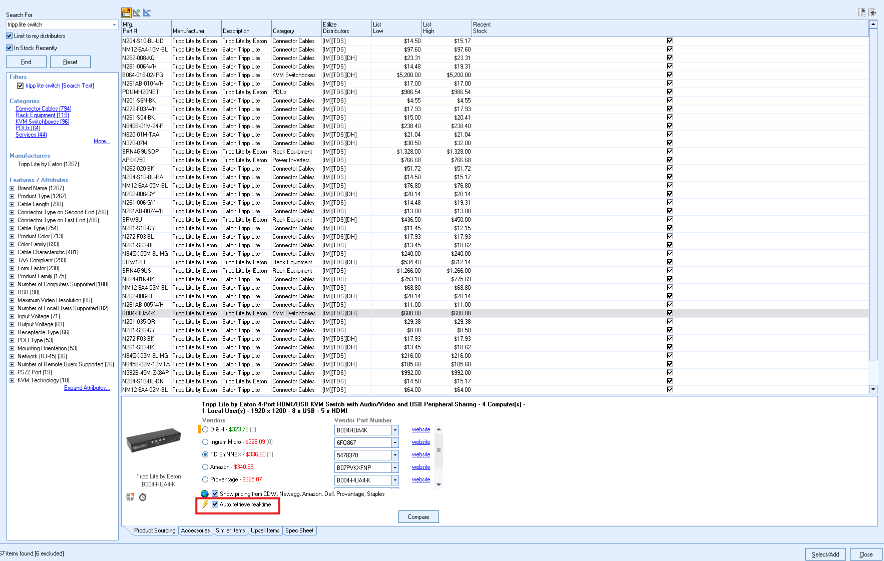 When you select an item, the item's image will display (if available) and you also have the option to automatically or manually pull Real-time Pricing & Availability from the supported distributors by checking either the Auto retrieve real-time option or by clicking the