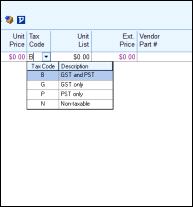 In the Tax Code column for each line item, you can type the tax code of "B" for GST and PST, "G" for GST only, "P" for PST only, and "N" for non-taxable. You can also choose these codes from the Tax Code drop-down box.
