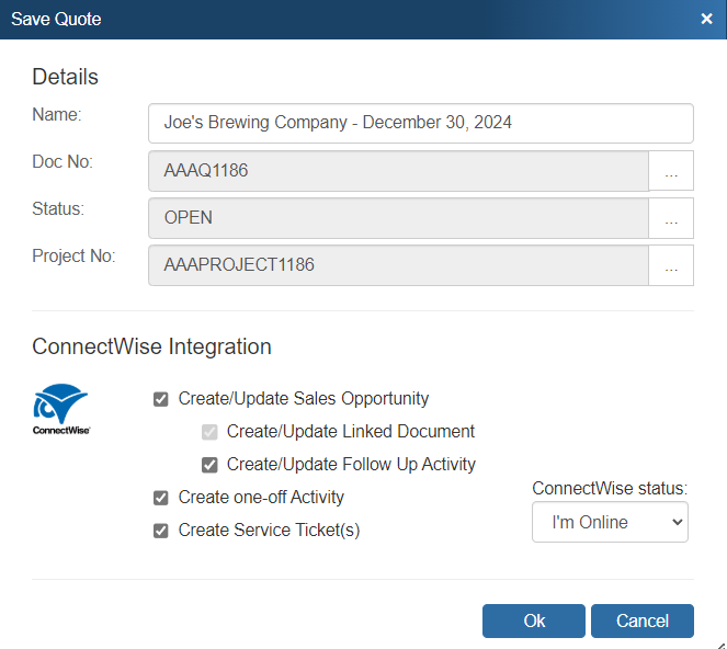 Note:When this is done, the ConnectWise account number embeds into the quote. QuoteWerks uses this account number to write information back to ConnectWise.