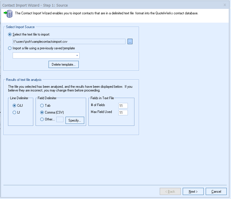 After you have selected the text file, QuoteWerks will attempt to determine if it is comma or tab- delimited. QuoteWerks will also attempt to determine how many columns of data there are in the text file. QuoteWerks will display the delimiter and number of columns that it found on this window. If you believe that QuoteWerks did not correctly detect the settings, you may change the settings.