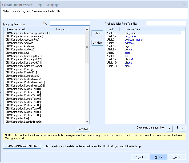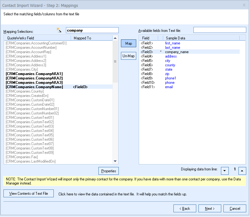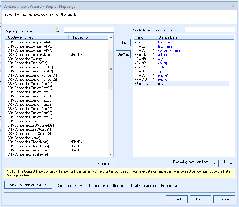 On this window, you will tell QuoteWerks how the columns of data in the text file will pair up with the fields in QuoteWerks that are used to store the contact name, company name, address, etc.