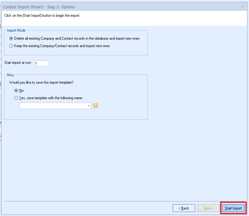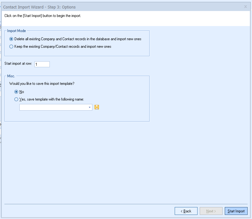 To save the wizard settings, select "Yes, save template with the following name:" and give the template a name. The next time you need to import the data you can load this import template and start the import process with only minor modifications. The contact import template files are stored in the SystemSettings table under the SectionName Contact Import Templates.