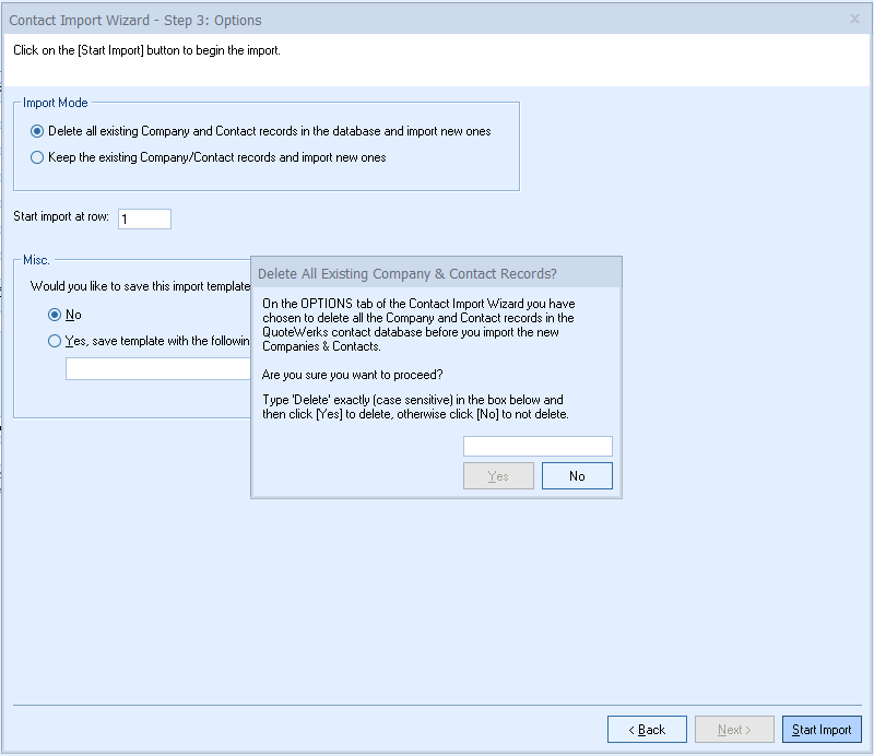If you have selected the option to "Delete all existing Company and Contact records in the database and import new ones" you will be prompted to confirm your selection.