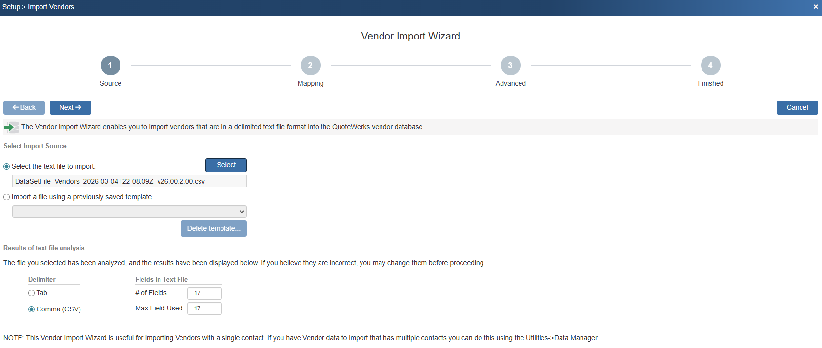 Note:When using the Vendor Import Wizard, there should be no other users running QuoteWerks.