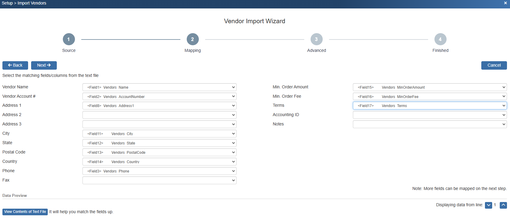 For example, click on the drop down arrow next to the “Vendor Name” label to select which column of data in the text file should be imported into the “Vendor Name” field in QuoteWerks.