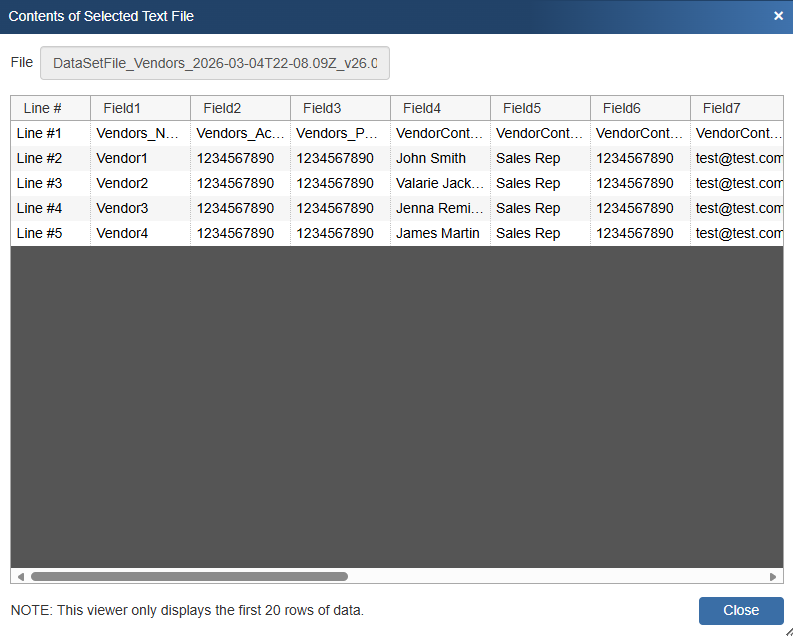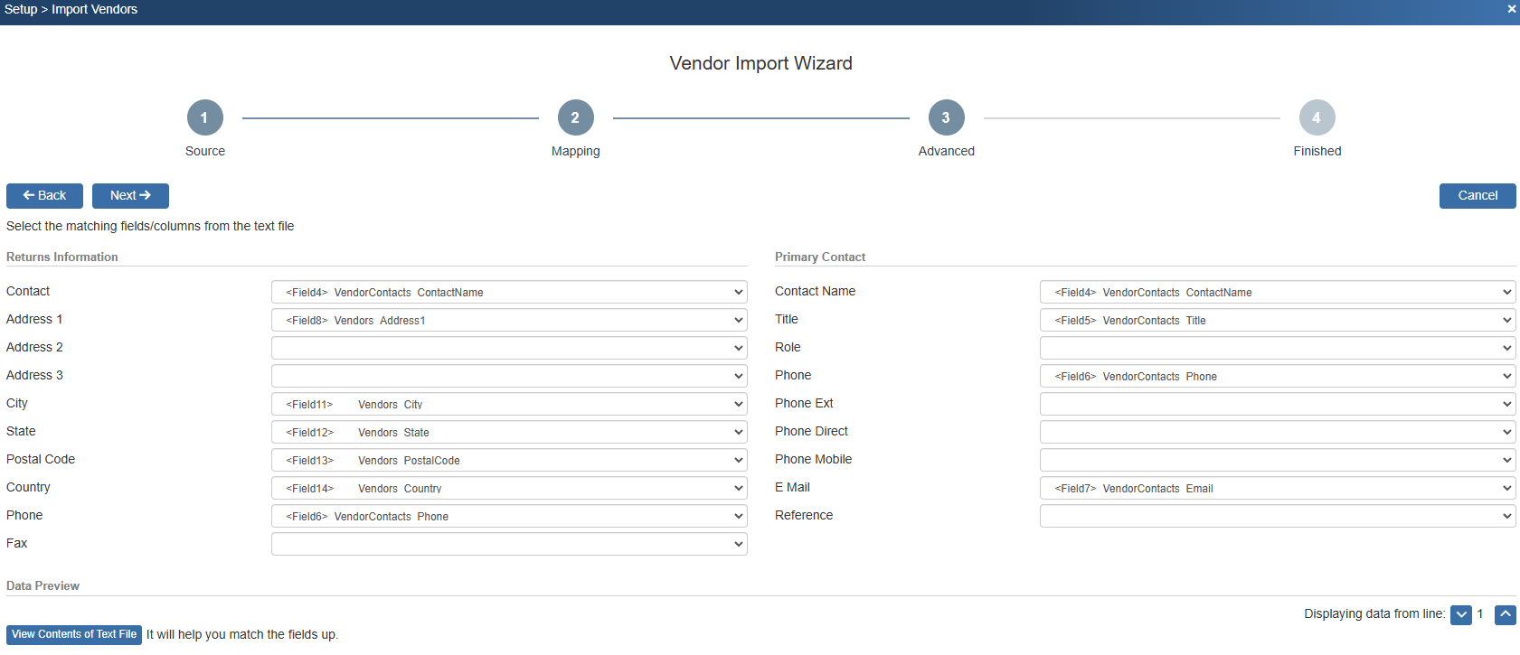 The Advanced Mapping window allows you pair up additional columns for the returns and Primary Contact. You can click on View Contents of Text File to see what data is contained in the file you are importing.