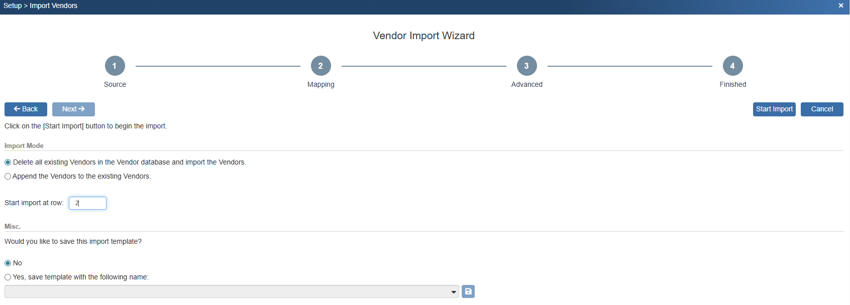 The Finish window allows you to set the Import Mode and allows to you choose whether to save the Import Settings as a template. Click on Start Import to begin your vendor import.