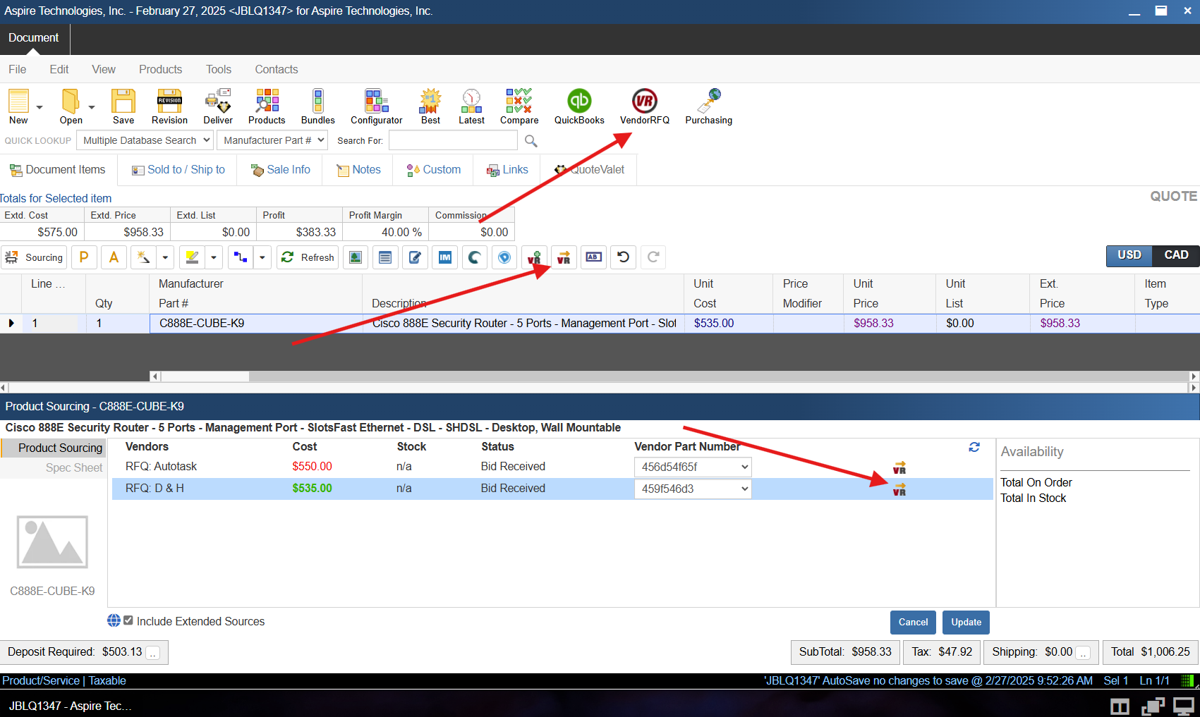 From QuoteWerks, you can launch the VendorRFQ Website from the VendorRFQ toolbar button, as well as from specific items that are associated to RFQs: