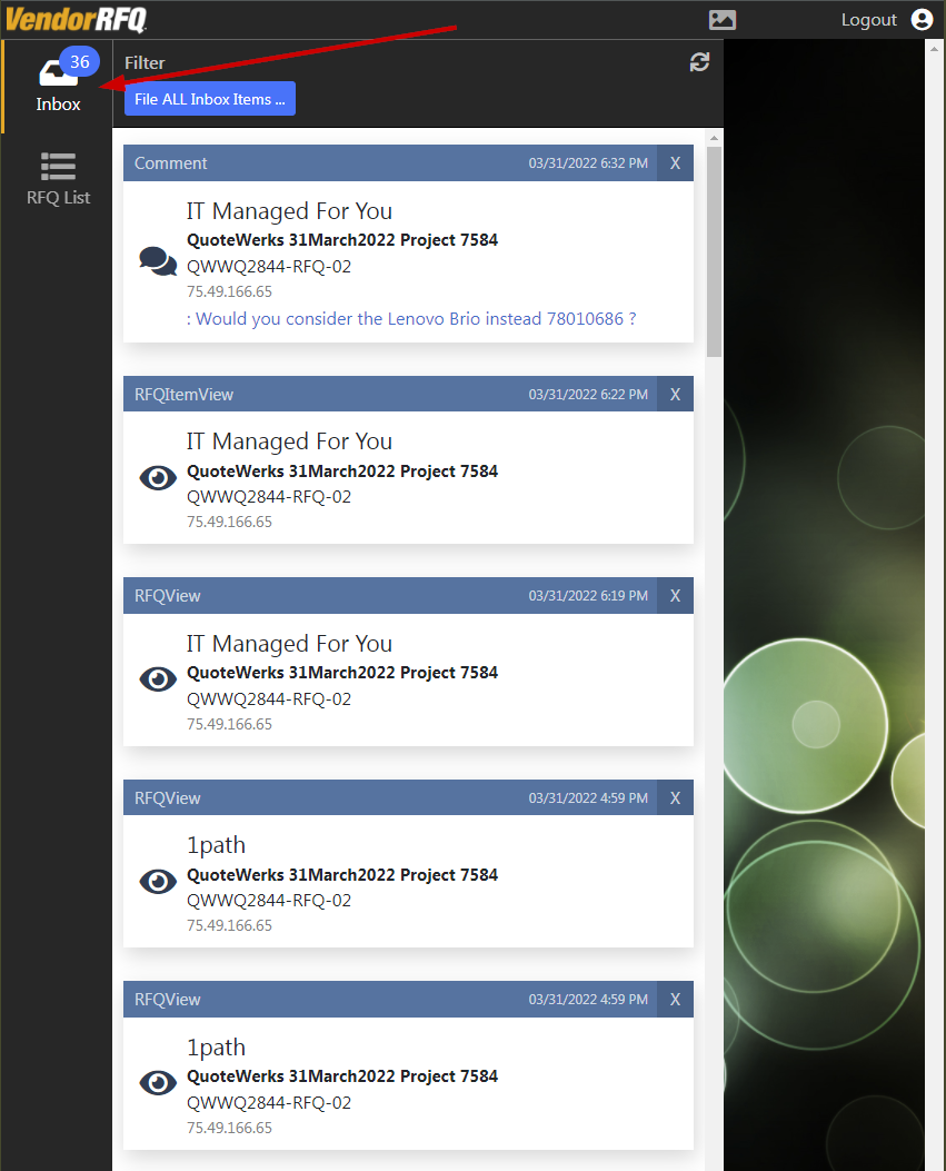 Clicking the Inbox will show activity on your VendorRFQs including RFQ views, RFQ Item views, and vendor comments: