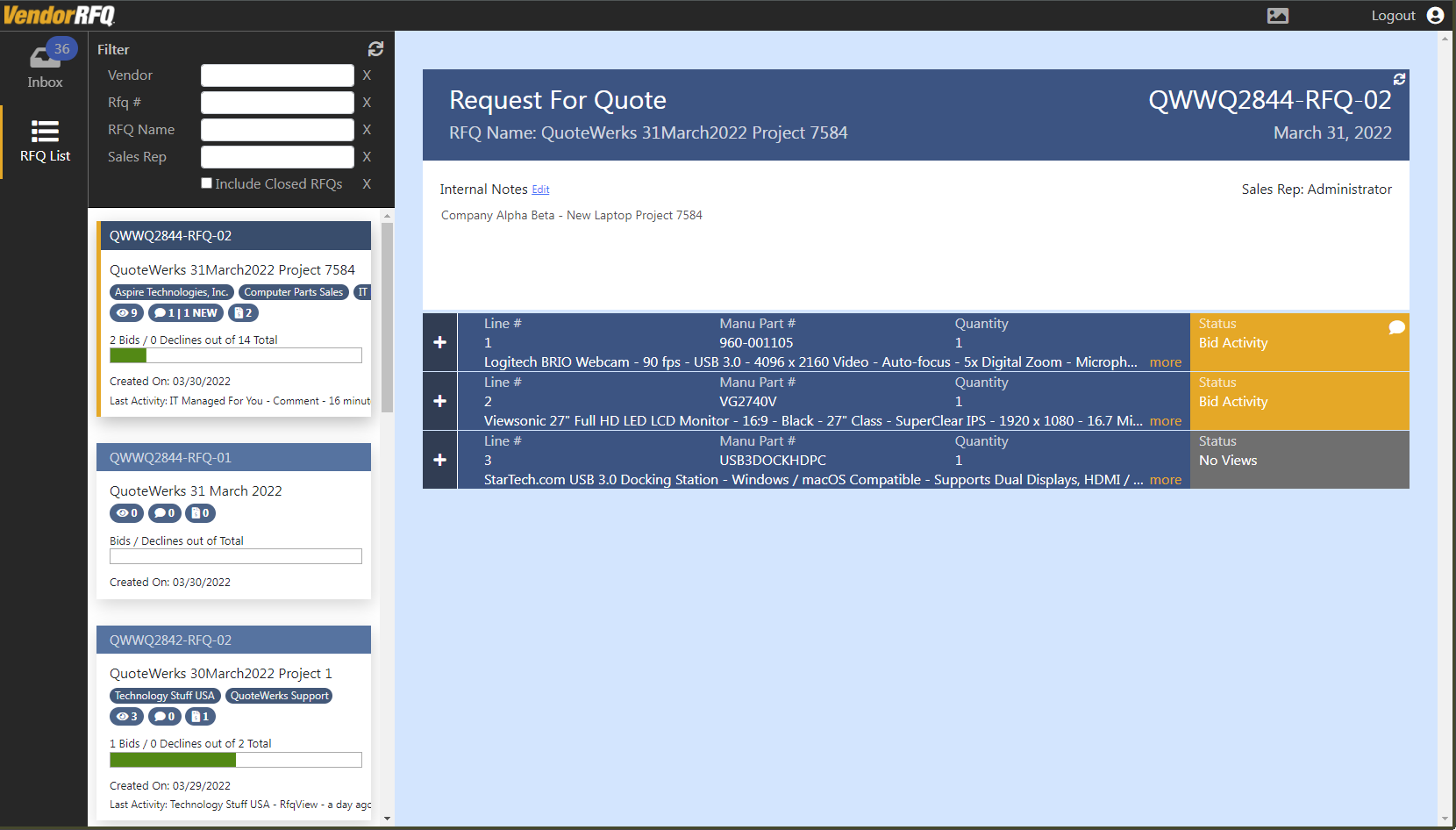 The VendorRFQ website allows to to view all of your RFQs, respond to vendor comments, award bids, and more.