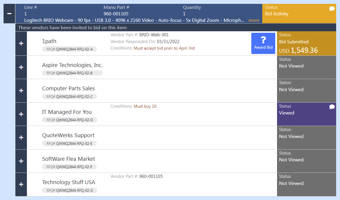 next to the item will display the vendor(s) invited to bid on that item as well as the information entered by that vendor such as vendor part number, date responded, conditions, and bid submitted: