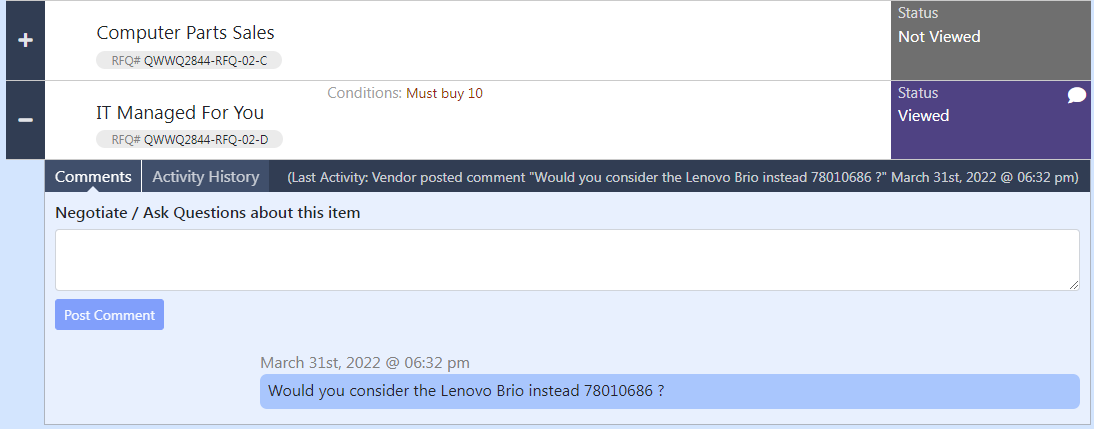 will expand the vendor on that item and allow you to ask questions, respond to comments, and view the activity history of that vendor on that item: