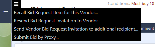Submit Bid by Proxy allows you to submit a bid on behalf of your Vendor. Usually you will use this if your Vendor has given you a price verbally or has sent you an email with pricing. You will be prompted for price, vendor part number, reference, and any conditions.