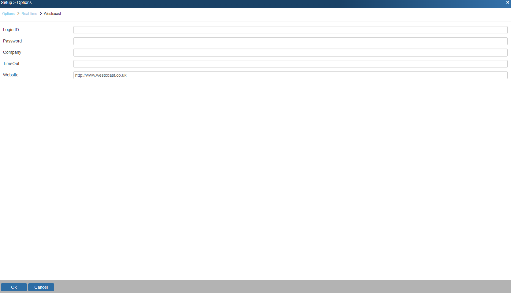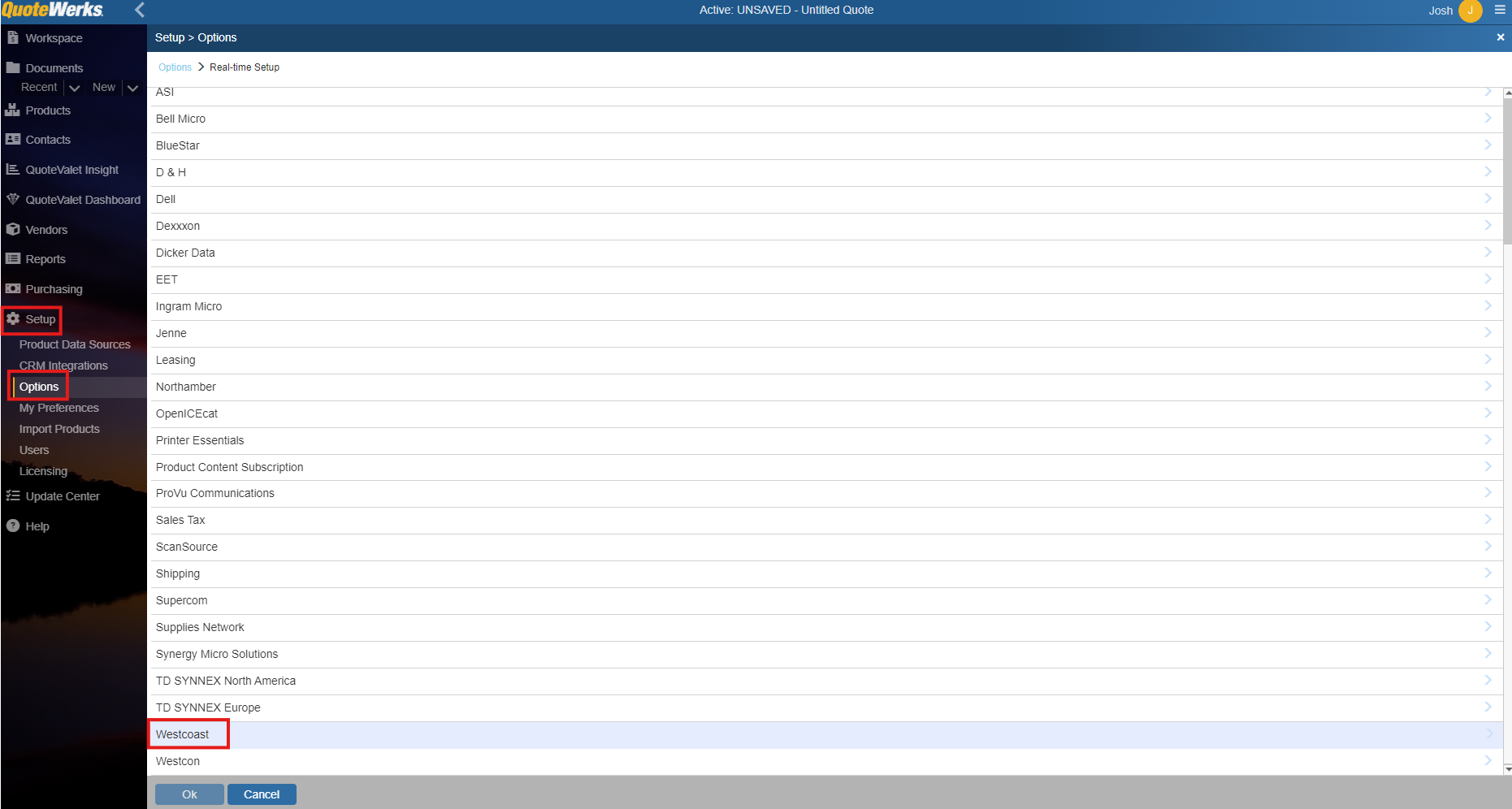 1. To setup Westcoast Real-time pricing and availability navigate to Setup > Options > Real-time Setup and select Westcoast.
