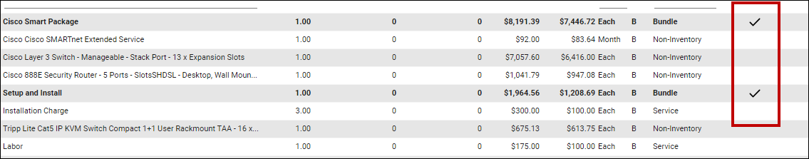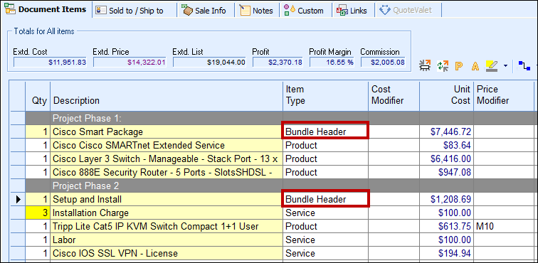 For example, below is a screenshot of how the quote might look when setup to use project phases. Notice the bundle heading lines have an item type that matches the mappings in the first screenshot above: