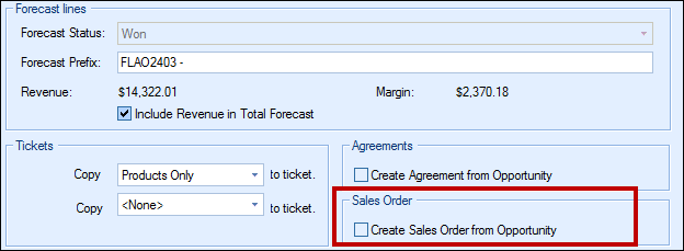 After the client has accepted the quote, convert the quote to order (File-> Convert to Order) to start the conversion process and update the opportunity as won in ConnectWise. On the Opportunity Window, ensure that the option to "Create Sales Order from Opportunity" is left unchecked.