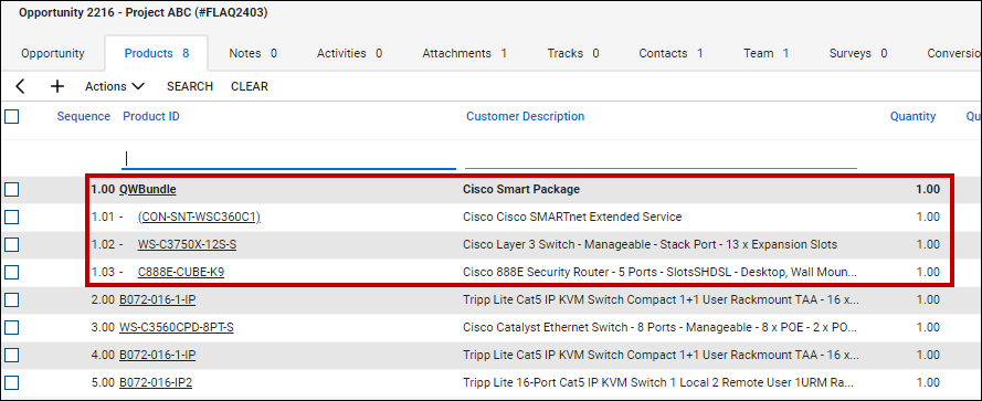 When this is saved back into the ConnectWise, the items on the Product tab in the opportunity will look similar to this: