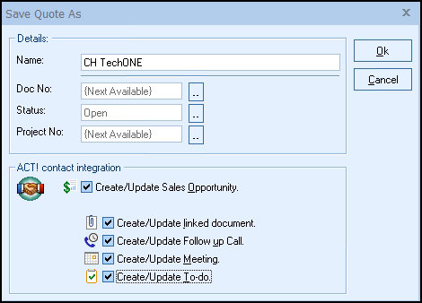 While ACT! is running and you choose to save a quote, you will have the option to write back information to ACT!