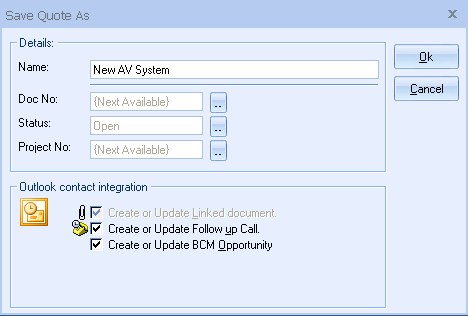 When Outlook is running, you will have the option to write information back to Outlook when you save the existing quote.