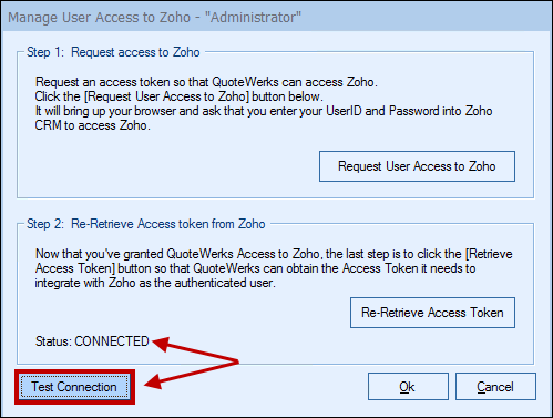 5.Once you click on that button, QuoteWerks and Zoho should be connected. Click on the [Test Connection] button to ensure it is working properly.
