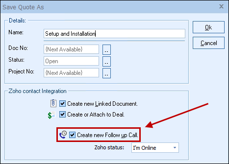 Note:The Create New Follow Up Call checkbox will NOT appear if you are saving a quote template.