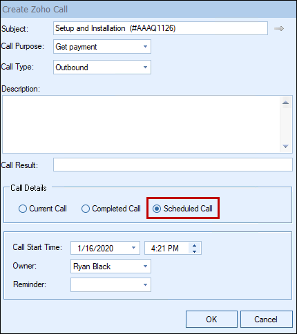 If you select the scheduled call option, you'll be able to set the start time, the owner, and set a reminder.