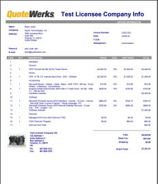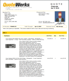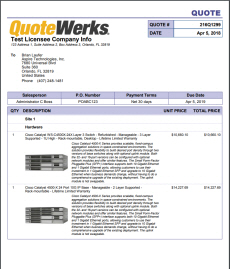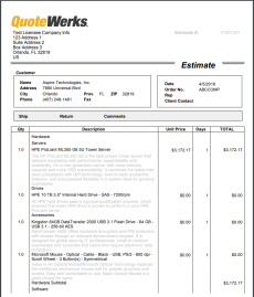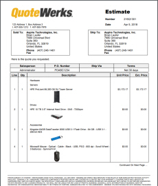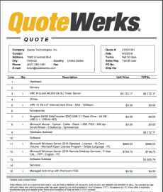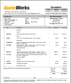 QuoteWerks layouts are designed to be easily customizable with company logos, different color schemes, as well as a variety of fonts. The layouts can also be customized to display or hide numerous fields from QuoteWerks. Users can choose to show line item pricing in groups or single items or hide them completely. Layouts can also be edited to include manufacturer, manufacturer part number, vendor, vendor part number, and many more.