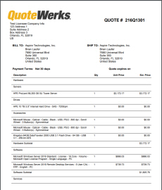 Starting with QuoteWerks Version 4.6, QuoteWerks users now have the ability to create Quote Layouts in Microsoft Word in addition to the built-in QuoteWerks Layout designer. You can download the free sample layouts below that can be customized for your business and industry. All of the samples include the Aspire and QuoteWerks logos as examples. You can, of course, remove them entirely, replace them, and/or add additional logos and pictures.
