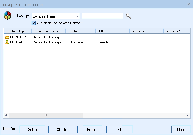 From the Sold To / Ship To tab of the QuoteWerks quote workbook, you can search the Maximizer database for a Company, Individual, or Contact. (Maximizer 10.0 and higher)