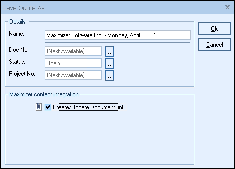 When saving a quote QuoteWerks automatically creates embeds a document under the Documents tab in Maximizer that links to the quote you are saving. When you are in Maximizer and select the Documents tab, you will see all the quotes that you have done for this Maximizer contact. You can even double-click on the document links, and QuoteWerks will open and display the quote the link refers to. This feature is very useful for organizing and finding your quotes from within Maximizer. In Maximizer 9 and lower QuoteWerks creates a document link rather than embedding the document.