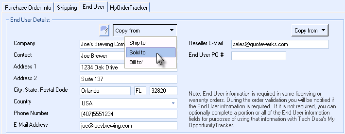 For license or warranty orders, the end user information can be easily copied from