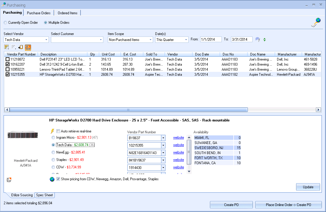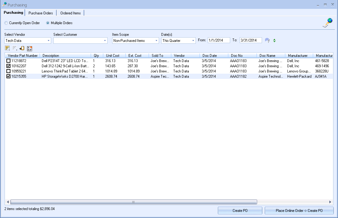 Order items for multiple orders electronically with Dell, D&H, Ingram Micro, and TD SYNNEX. |