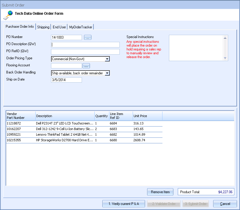 QuoteWerks fully supports Tech Data's MyOrderTracker service, optionally enabling