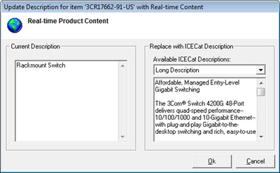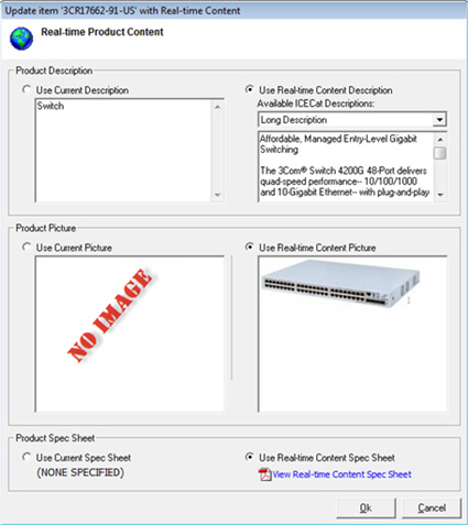 From the Product Lookup window, select a product, right-click on it, and select the Real-time Product Content menu. This will display the Real-time Product Content window. This window will display the data you currently have for the product and will also show you the content that is available from OpenICEcat for this product. OpenICEcat content typically includes descriptions, pictures, and spec sheets although not all of this information may be available for every item.