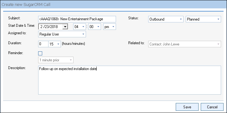 When saving a quote, QuoteWerks offers to schedule a follow up call for you in SugarCRM.