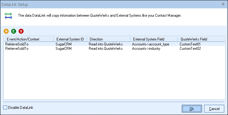 The SugarCRM DataLink is bi-directional, so field information can be copied from QuoteWerks into the SugarCRM opportunity and then fields can also be copied from the SugarCRM Opportunity into QuoteWerks. For SugarCRM Enterprise users, information from QuoteWerks line items can be copied into SugarCRM Opportunity Revenue Line Items and information can be copied from the SugarCRM Opportunity Revenue Line Items into the QuoteWerks line items.