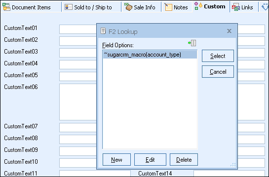 Many of the fields in QuoteWerks have a lookup list option. When you press the F2 key while in one of these fields, QuoteWerks will display a list of values that you can choose for the field. You can create a macro value that pulls information from a field in SugarCRM. For example, if you press the F2 key while in the terms field in QuoteWerks, QuoteWerks will display a list of terms options that you have previously entered. You can create a new option that retrieves a value from a field in SugarCRM that you use to store your terms.