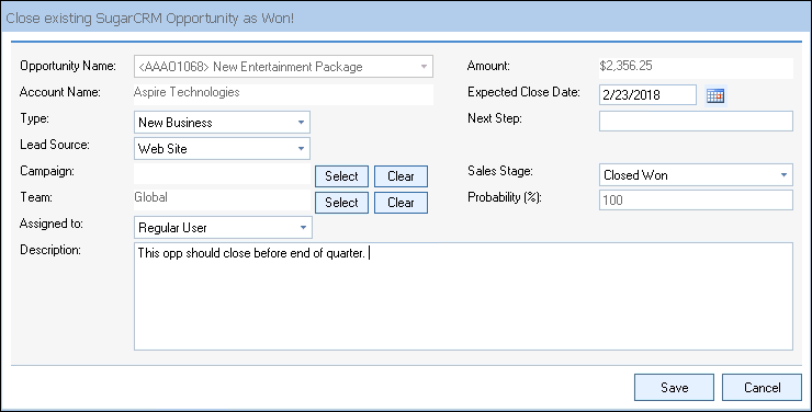 We create quotes with the expectation that the quotes will become orders. When the customer accepts the quote, QuoteWerks will convert the quote to an order and also convert your existing SugarCRM Sales Opportunity into a "Closed as Won" sale. If no Sales Opportunity exists in SugarCRM  (This would be the case if a customer called to place an order without requesting a quote first), QuoteWerks will simply create a new "Closed as Won" Sales Opportunity in SugarCRM.