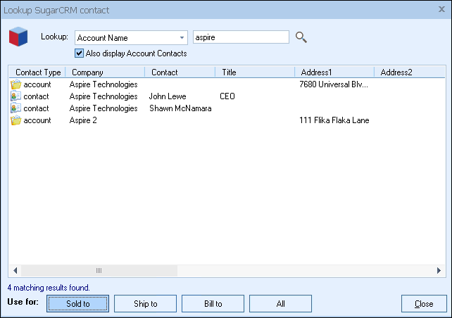 From the Sold To / Ship To tab of the QuoteWerks quote workbook, you can search the SugarCRM database for a contact by name or phone number.  You can also search for an Account by company name or phone number. QuoteWerks will fill in the contact information in the quote by pulling the contact information from the contact that you searched for. You will never have to re-type your customer information. Additionally, any Contacts associated with an Account can be returned with the search results.