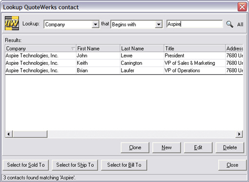 The QuoteWerks contact lookup search window has been redesigned. You can now perform searches by company name, last name, phone number, or e-mail address. You can run "Equal to", "Not Equal to", "Begins with", "Ends with", "Contains", and "Does not Contain" searches. The matching results will automatically populate as you type. Columns can be re-ordered, resized, and sorted (by clicking on column header). Clicking the column header again will reverse sort the column. Column orders, sizes, and last sort column are remembered per each user.