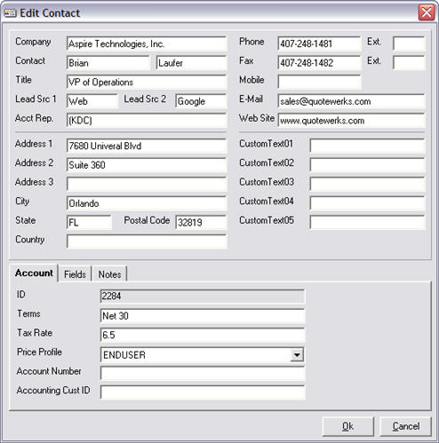 Added fields AccountRep, LeadSource1, LeadSource2, CustomText01, CustomText02, CustomText03, CustomText04, CustomText05, CustomText06, CustomText07, CustomText08, CustomText09, CustomNumber01, CustomNumber02, CustomDate01, CustomDate02 fields to the QuoteWerks contact database. Also added DataLink support for all these fields.