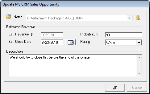 For MS Dynamics CRM 4.0 users, on the Create/update MS CRM Sales Opportunity window, there is now a button that will open the MS CRM Opportunity in MS CRM.