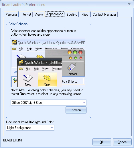 Updated QuoteWerks Interface! Color Schemes/Skins are now supported in QuoteWerks under the Appearance tab of the Tools->My Preferences user. Color schemes control the appearance of menus, buttons, text boxes and more. QuoteWerks can now look like Windows Vista, Office 2007, or even like a Mac application. You have to see it to believe it! It is really amazing. Each user can choose their own color scheme enabling them to express their personal preferences.